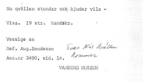 //// Nu qvällen stundar och bjuder vila -Visa. 19 str. handskr. //// Vessige sn //// Ref. Aug.Bondeson ^^ ^ /befa*-Acc.nr 3490, sid. 14. //// VARBERG MUSEUM ////