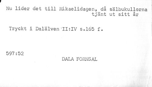 //// Nu lider det till Mikaelidagen, då sälbukullorna //// tjänt ut sitt år //// Tryckt i Dalälven II:IV s.165 f. 597:52 //// DALA forns AL ////