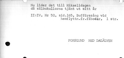 //// Nu lider det till Mikaelidagen då sälbukullorna tjänt ut sitt år //// II:IV, Nr 52, sid.165, Bufförssång vid //// hemflyttn.fr.fäbodar, 1 str. //// FORSLUND MED DALÄLVEN ////