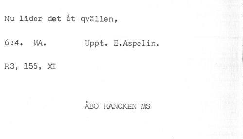 //// Nu lider det åt qvällen, ! //// 6:4. MA. Uppt. E.Aspelin. //// R3, 155, XI //// ÅBO RANCKEN MS //// ! i ////