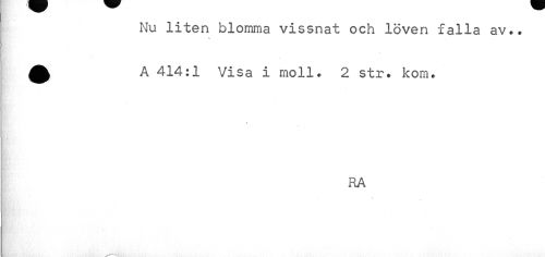 //// Nu liten blomma vissnat och löven falla av*. //// N. //// A 414:1 Visa i moll. 2 str. kom. //// //// /; I ' ' ' ' //// RA //// ¦ //// mtimM .v ////