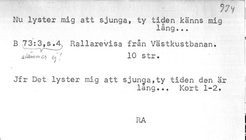 //// 77 V //// Nu lyster mig att sjunga, ty tiden känns mig //// lång... //// B 73:3,5.4, Rallarevisa från Västkustbanan. //// 10 str. //// ¦ //// Jfr Det lyster mig att sjunga,ty tiden den är //// lang... Kort 1-2. //// RA | ////