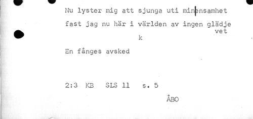 //// Nu lyster mig att sjunga uti minjsnsamhet //// fast jag nu här i världen av ingen glädje ^^ vet //// En fånges avsked //// « //// 2:3 KB SLS 11 s. 5 //// ÅBO ////