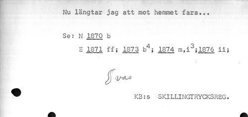 //// Nu längtar jag att mot hemmet fara... Se: N 1870 b //// OMMRMMMMI //// E 1871 ff; 1873 b4} 1874 m,i3;1876 ii; //// » //// (j'i/t^o //// ^ K3:s SKILLINGTRYCKSREG. ////