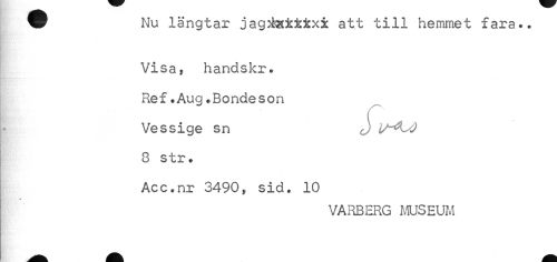 //// W Nu längtar jag^fcaifcfcxi att till hemmet fara.. //// Visa, handskr. Ref.Aug.Bondeson //// f „ //// Vessige sn j //// 3 str. //// Acc.nr 3490, sid. 10 //// VARBERG MUSEUM ////