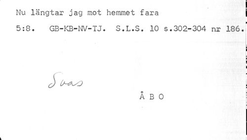 //// Nu längtar jag mot hemmet fara | //// i //// 5:8. GB-KB-NV-TJ. S.L.S. 10 s.302-304 nr 186.1 //// i ¦ //// F //// E | //// ¦ i //// J U-t^O j //// ÅBO t ////