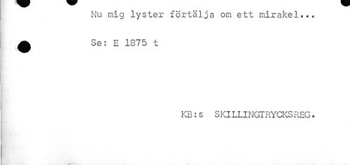 //// Nu mig lyster förtälja om ett mirakel... A Se: E 1875 t //// KB:s SKlLLINGTRYCKSREG. //// \ ////