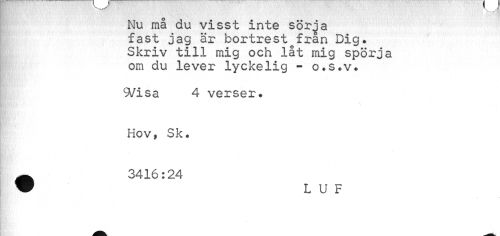//// Nu må du visst inte sörja fast jag är bortrest från Dig. Skriv till mig och låt mig spörja om du lever lyckelig - o.s.v. //// 9/isa 4 verser. Hov» Sk. ^ 3416:24 ////