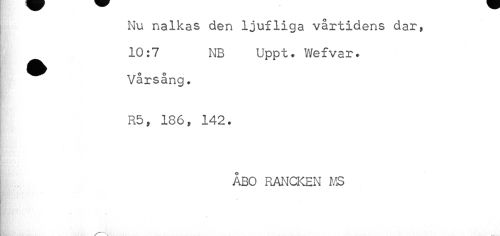 //// Nu nalkas den ljufliga vårtidens dar, 10:7 NB Uppt. Wefvar. //// Vårsång. //// R5, 186, 142. //// HW; \ //// ÅBO RANCKEN MS //// Bp' ////