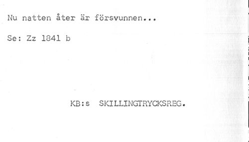 //// I //// Nu natten åter är försvunnen... //// Se: Zz 1341 b j //// a //// I //// j //// i ¦ //// . ¦ //// i //// KB:s SKILLINGTRYCKSREG. //// £ //// v ////