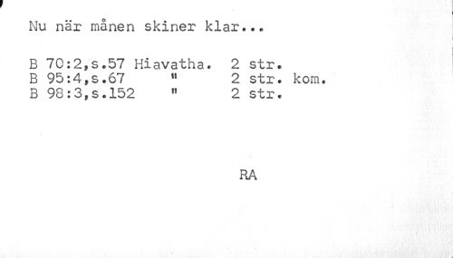 //// ! //// Nu när månen skiner klar... j //// j //// B 70:2»s.57 Hiavatha. 2 str. B 95:4,s.67 » 2 str. kom. //// B 98:3,s.152 " 2 str. //// RA ////