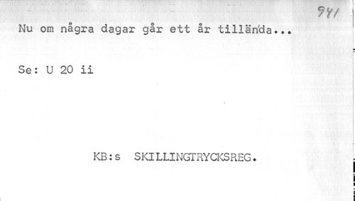 //// 7 Y/ ¦ //// Nu om några dagar går ett år tillända... //// r //// Se: U 20 ii //// i //// i //// j //// I- //// KB:s SKILLINGTRYCKSREG. //// ! //// i //// i //// i ¦ ////