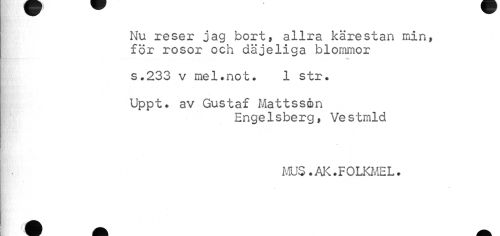 //// Nu reser jag bort, allra kärestan min, för rosor och däjeliga blommor //// s.233 v mel•not. 1 str. //// Uppt. av Gustaf Mattsson //// EngeIsberg, Vestmld //// MUS.AK.FOLKMEL. ////