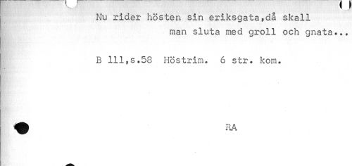 //// " 1 //// Nu rider hösten sin eriksgata»då skall //// man sluta med groll och gnata... //// B 111 »s« 58 Höstrim. 6 str. kom. //// i //// f\- • 1 ////