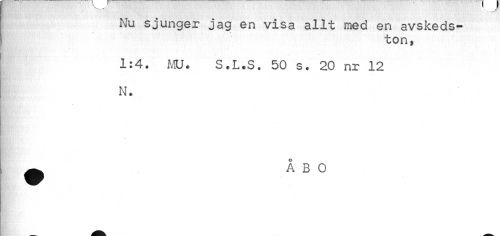 //// Nu sjunger jag en visa allt med en avskedston» //// 1:4. MU. S.L.S. 50 s. 20 nr 12 N. //// ^ ÅBO ////
