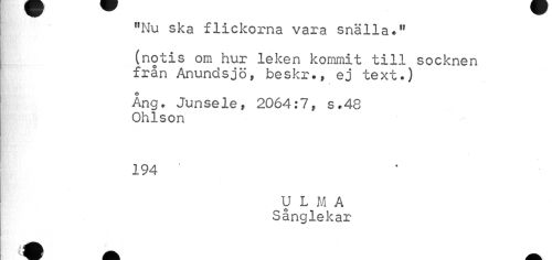 //// "Nu ska flickorna vara snälla." //// (notis om hur leken kommit till socknen från Anundsjö, beskr., ej text.) //// Ang. Junsele, 2064:7, s.48 Ohlson //// 194 ' //// U L M A Sånglekar ////