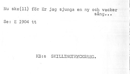 //// Nu ska(11) för Er jag sjunga en ny och vacker , //// sång... //// \ //// Se: E 1904 tt I //// ! //// i //// I //// i //// KB:s SKILLINGTRYCKSREG. //// //// /
