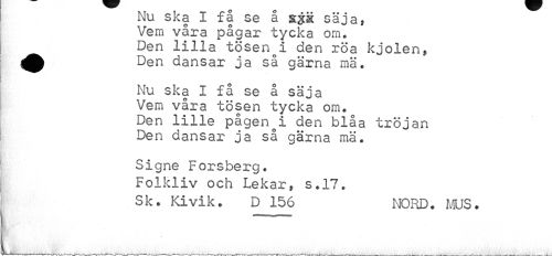 //// Nu ska I få se å säja, Vem våra pågar tycka om. Den lilla tösenoi den roa kjolen, ^^ Den dansar ja så gärna mä. //// Nu ska I få se å säja Vem våra tösen tycka om. Den lille pågen^i den blåa tröjan Den dansar ja så gärna mä. //// Signe Forsberg. //// Folkliv och Lekar, s.17. //// Sk. Kivik. D 156 NORD. MUS. //// K'' ' Å' ////
