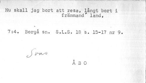 //// Nu skall jag bort att resa, långt bort i //// främmand' land, ; //// v I //// 7:4. Borgå sn. S.L.S. 18 s. 15-17 nr 9. I //// ( //// J »^o //// i //// ÅBO | //// f ////