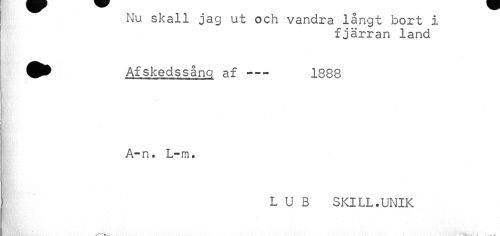 //// Nu skall jag ut och vandra långt bort i //// fjärran land //// Afskedssång af--- 1888 //// A-n. L-m. //// L U B SKILL.UNIK ////