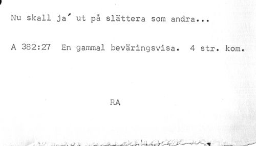 //// Nu skall ja' ut på slättera som andra*.. A 382:27 En gammal beväringsvisa. 4 str. kom. //// RA //// >> . . > _ ____..: _ _ ' ^ ////