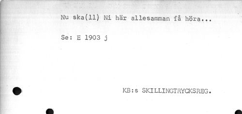 //// Nu ska(11) Ni här allesamman få höra... Se: E 1903 j //// f //// 9 KB:s SKILLINGTRYCKSREG. ////