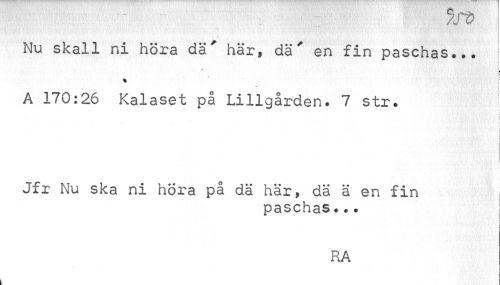 //// ¦" 7SV //// rim //// Nu skall ni höra dä' här, dä' en fin paschas... //// A 170:26 Kalaset på Lillgården. 7 str. ! //// | //// ! //// Jfr Nu ska ni höra på dä här, dä ä en fin . //// paschas... //// RA ////