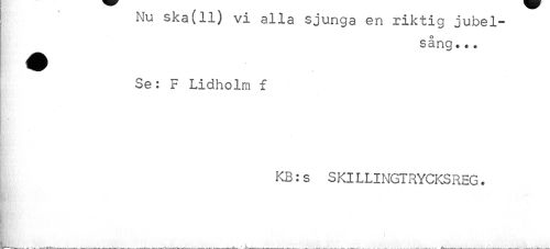 //// Nu ska(11) vi alla sjunga en riktig jubelsång . *. //// Bra! //// Se: F Lidholm f //// KB:s SKILLINGTRYCKSREG. //// I ////