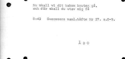 //// ^ ANu skall vi dit bakom knuten gå, //// och där skall du utav mig få //// 8:4? Svenssons saml.häfte Nr 27. s.8-9. //// ÅBO ////