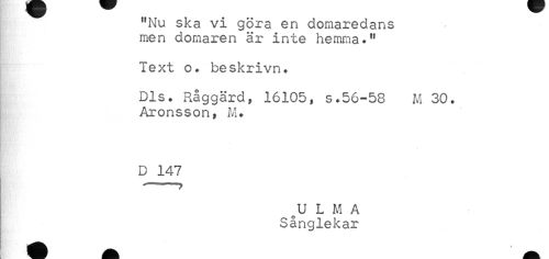 //// "Nu ska vi göra en domaredans men domaren är inte hemma*11 //// Text o. beskrivn. //// Dis. Råggärd, 16105, s.56-58 M 30. Aronsson, M. //// D 147 //// ULHA //// Sånglekar ////