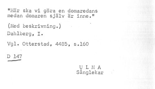 //// f,Här ska vi göra en domaredans medan domaren själv är inne." //// (Med beskrivning.) Dahlberg, I. //// Vgl. Otterstad, 4485» s.160 D 147 //// U L M A //// Sånglekar ////