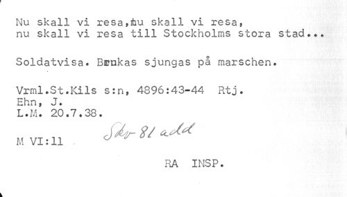 //// Nu skall vi resa,ibu skall vi resa, //// nu skall vi resa till Stockholms stora stad... //// Soldatvisa* Bsrakas sjungas på marschen* //// Vrml.St.Kils s:n, 4896:43-44 Rtj• nhni vT * //// L.M. 20.7.38. //// jÅtrS //// /M VI:11 • ° ^ //// RA INSP. ////