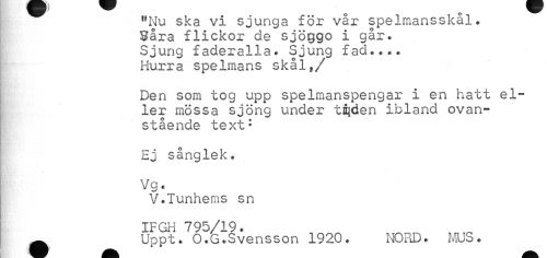 //// "Nu ska vi sjunga för vår spelmansskål. Såra flickor de sjöggo i går. Sjung faderalla. Sjung fad.... Hurra spelmans skål, //// /Den som tog upp spelmanspengar i en hatt eller mössa sjöng under t^den ibland ovanstående text: //// Ej sånglek. //// Vg. //// V.Tunhems sn //// IFGH 795/19. //// ^ Uppt. O.G.Svensson 1920. NORD. MUS. ////