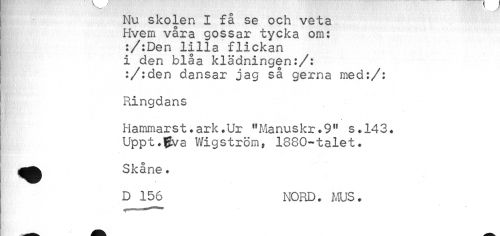 //// Nu skolen I få se och veta Hvem våra gossar tycka om: :/:Den lilla flickan i den blåa klädningen:/: :/:den dansar jag så gerna med:/: //// Ringdans //// Hammarst • ark .Ur 11 Manus kr .9" s. 143. Uppt.fjva Wigström, 1880-talet. //// Skåne. //// D 156 NORD. MUS. ////