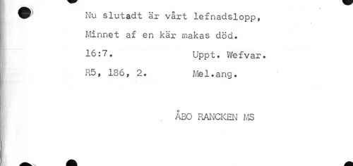 //// Nu slutadt är vårt lefnadslopp, Minnet af en kär makas död. 16:7. Uppt. Wefvar. //// R5, 186, 2. Mel.ang. //// ÅBO RANCKHN MS ////