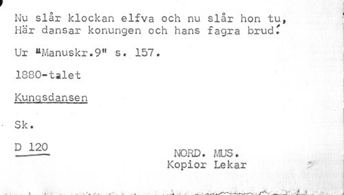 //// Nu slår klockan elfva och nu slår hon tu, ! //// ^ A //// Har dansar konungen och hans fagra brud. //// Ur uManuskr.9" s. 157. //// 1880-talet //// Kungsdansen //// Sk. //// I //// 5lh2. nord. mus. //// Kopior Lekar 3 //// > 1 •'' ; Va //// K- //// .. c ... \ ^^____ _ . ^ wv / v-- A > / , -i ////
