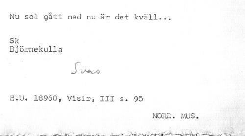 //// Nu sol gått ned nu är det kväll... //// Sk //// Björnekulla //// SL^SO //// E.U. 18960f Visir» III s. 95 //// NORD. MUS. ////