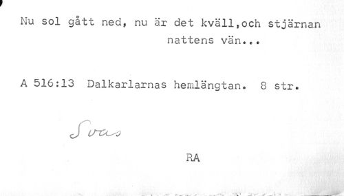 //// Nu sol gått ned» nu är det kväll»och stjärnan //// nattens vän # € # //// A 516:13 Dalkarlarnas hemlängtan. 8 str. //// RA ////