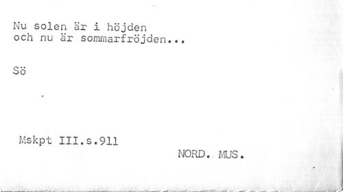 //// v. //// Nu solen är I höjden och nu är sommarfröjden... //// SÖ //// t //// * //// Mskpt III.s.911 //// NORD., MUS. //// - I ..i. i----- ® ^ ////
