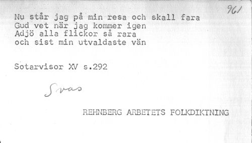 //// o o 70 //// /Nu står jag pa min resa och skall fara Gud vet när jag kommer igen Adjö alla flickor så rara //// och sist min utvaldaste van //// .. • i //// i f //// Sotarvisor XV s.292 //// REHNBERG ARBETETS FOLKDIKTNING //// { i ////