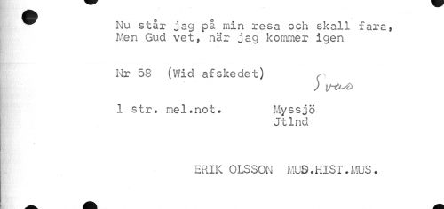 //// ^ Nu står jag på min resa och skall fara, //// Men Gud vet, när jag kommer igen //// Nr 58 (Wid afskedet) //// 1 str. mel.not. Myssjö //// Jtlnd //// ERIK OLSSON MUB.HIST.MUS. ////
