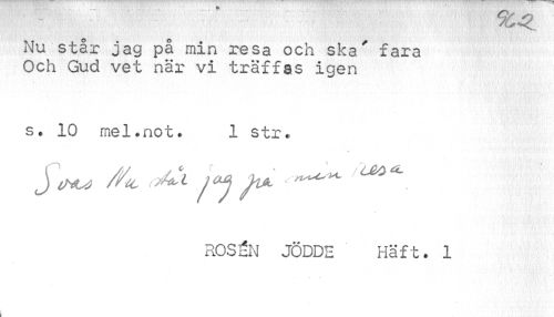 //// - ¦..... //// Nu står jag på min resa och ska' fara //// Och Gud vet när vi träffas igen //// s. 10 mel.not. 1 str. //// J ^ fl JvL t""-. //// ROSÉN JÖDDE Haft. 1 ////