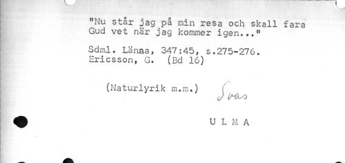 //// n //// ftNu står jag på min resa och skall fara //// Gud vet när jag kommer igen..." //// Sdml. Länaa, 347:45, s. 275-276. Ericsson, G. (Bd 16) //// (Naturlyrik m.m.) //// J H^o ////