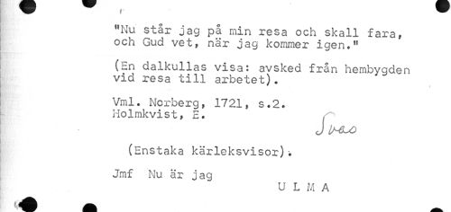 //// "Nu står jag på min resa och skall fara, //// och Gud vet, när jag kommer igen." //// (En dalkullas visa: avsked från hembygden vid resa till arbetet). //// Vml. Norberg, 1721, s.2. Holmkvist, E. //// J ih&^O //// (Enstaka kärleksvisor) Jmf Nu är jag //// U L M A //// a. ^ ////