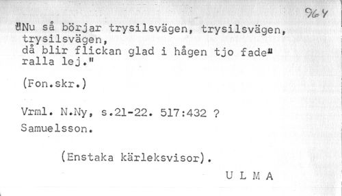 //// % y //// fl Nu så börjar trysilsvägen* trysilsvägen* trysilsvägen, I //// då blir flickan glad i hågen tjo fade* ralla lej.11 //// • 1 ; ' ' ¦ ' '..' ,• * \> '. V' "j ) -V/ •*• \-I ¦¦ i I //// (Fon.skr.) //// Vrral. N.Ny, s.21-22. 517:432 ? Samuelsson. //// (Enstaka kärleksvisor). //// i //// U L M A ////