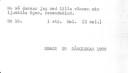 //// Nu så dansar jag med lilla vännen min ljusblåa ögon, rosendekind. //// Nr 16. 1 str. Mel. (2 mel.) //// BRAGE 20 SÅNGLEKAR 1908 ////