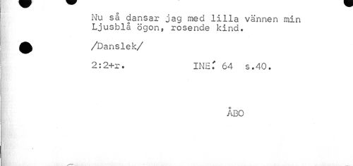 //// Nu sa dansar jag med lilla vännen min Ljusblå ögon, rosende kind. //// 0 /Danslek //// /2:2+r. INE? 64 s.40* //// ÅBO ////