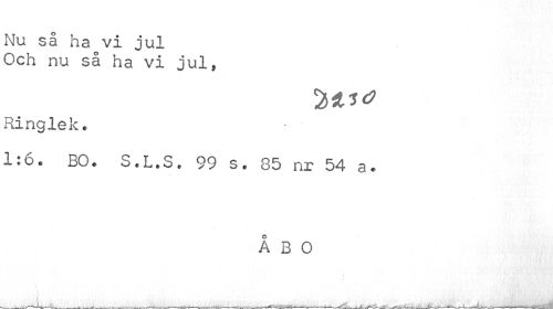 //// Nu så ha vi jul Och nu så ha vi jul, //// Ringlek. //// 1:6. BO. S.L.S. 99 s. 85 nr 54 a. //// ÅBO ////
