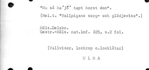 //// "Nu så ha'jo' tapt borst dom". //// (Mel.t. "Vallpigans sorg- och glädjevisa".) //// Häls.Delsbo. //// Gestr.-Häls. nat.lmf. 325, s.2 £ol. //// (Vallvisor, lockrop o.locklåtar) //// U L M A ////