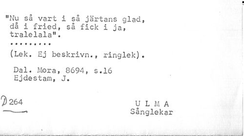 //// wNu så vart i så järtans glad, då I fried, så fick i ja, tralelala". //// (Lek. Ej beskriva., ringlek)? ! //// Dal? Mora, 8694, s.16 Ejdestam, J. //// } 264 U L M A //// —*—Sånglekar ////